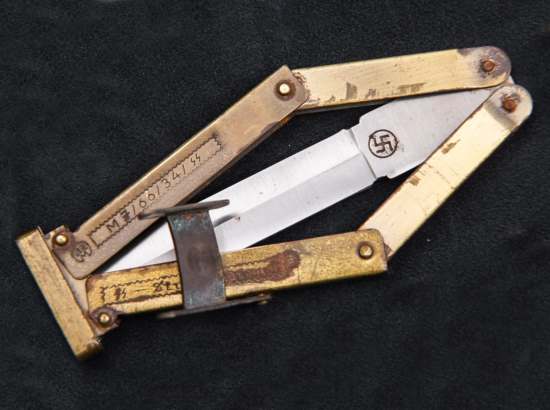 Этот нож является мечтой многих начинающих коллекционеров. Чудесный предмет, который из бруска латуни превращается в злой техничный нож. Такие ножи регулярно всплывают в сети по ценам от 100$ до 500$, под очень кричащими названиям, вроде «Нож парашютистов СС», «Секретный нож спецподразделений Аненербе» или даже «Стальной нож патрульных отрядов СС».
